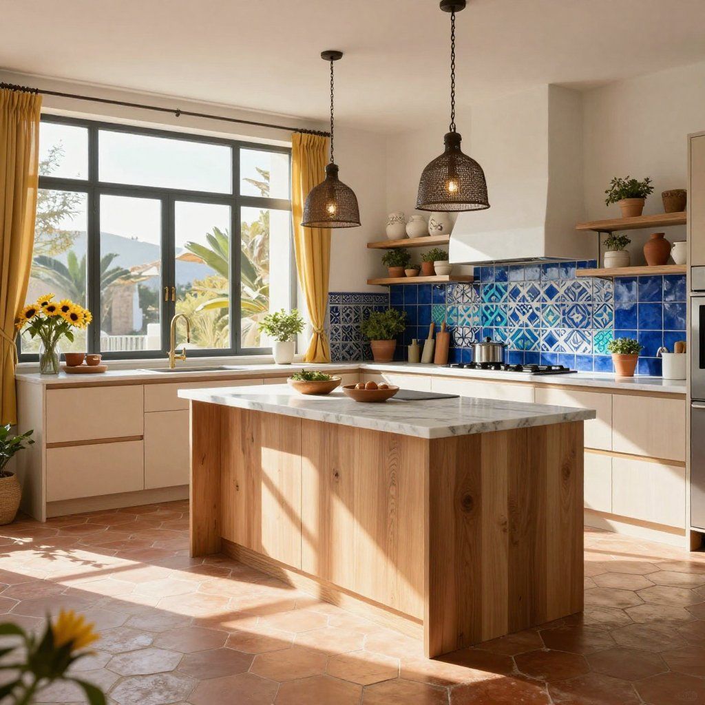 Open-plan living space redesigned to maximize natural light and flow, incorporating durable materials suited for Mediterranean climates.